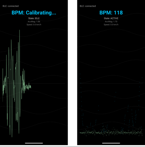 まず、アプリの基本挙動は結構安定していた。走り出しのBLE受信からBPM表示までスムーズに動き、停止すれば正しくidleに入り、再びこぎ始めると自然に復帰する。一方で、BPMが実際の走行スピードに追従しきれていない点など、実走ならではの課題も明確になった。ピーク検出が乱れやすく、速度変化への反応が遅れたり、逆に急に跳ねたりする場面があった。