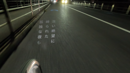 作品の制作は自転車から路面にテキストをプロジェクションする関係で夜間に限られる。ここ数日は真夜中に自宅から這い出て、公園で機材をセッティングし、商店街や近所の道路をサイクリングしている。映り込みを避けるために撮影はJRの終電が終わった後に行うので必然的に遅くなる。コロナ禍の頃も、しばしば夜に近所を徘徊していた。密を避けるためではなく、当時の自分には内省する時間と少しの運動が必要だったのだ。