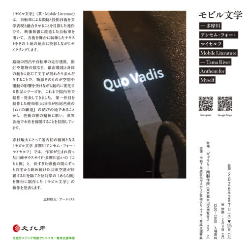 「モビル文学」は、自転車による移動と投影技術を文学表現と融合させることを目指した連作です。映像装置に改造した自転車を用いて、各街を舞台に執筆したテキストをその土地の地面に投影しながらサイクリングします。