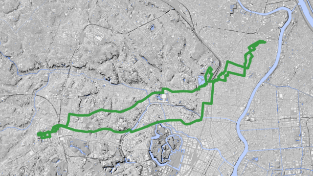 復路においては、地形への適応ではなく、地図上の最短距離に近い「幾何学的な直線」を選択した。