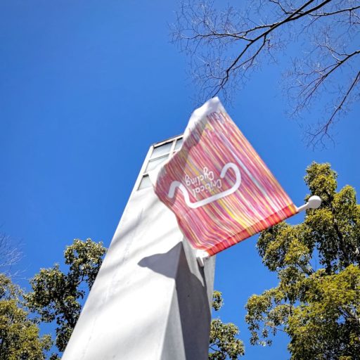 幸い会期中の岐阜県大垣市の天気は快晴。14日の最高気温は15度とぽかぽかしたよい天気だった。しかし、風は強く、15日の瞬間最大風速は15.3m/sだったとのこと(気象庁サイト)。実際、野外展示会場に設けられたフラッグは、ほぼ水平にたなびいていた。