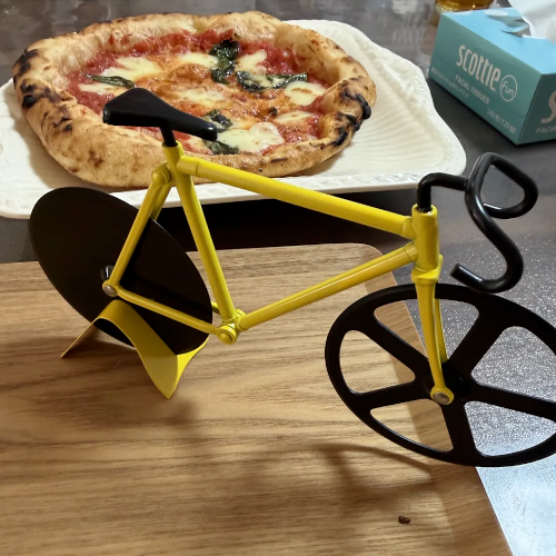 今回入手したのはピザカッターである。だいたい2,500円ぐらい。ただし、そのかたちはピストバイクだ。黄色いクロモリ風のフレームに、前輪はバトンホイール、後輪はディスクホイール。ドロップハンドルにサドル。ホイールの刃でピザを切る、という仕組みになっている。