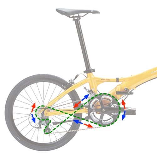 ある日、ふと思い立った。チェーンを「たすき掛け」にすれば、後ろへ進めるのではないか、と。図の緑のようにチェーンを渡してペダルを踏めば、青い矢印の方向にチェーンが回り、後輪は逆回転する。だが、次の瞬間気がついた。自転車はフ