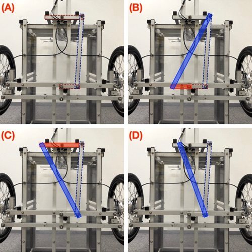 逆さまペダルがあるなら、逆さまハンドルだってあるはず。だが、逆さまペダルはチェーンの「たすき掛け」で簡単に実現できたものの、逆さまハンドルの仕組みは見当がつかない。ハンドルを右に切ると、前輪が左を向くと良いのだが、ハンド