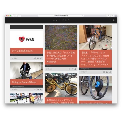 クリティカル・サイクリングではWEBサービスのTumblrを利用して、自転車関連の情報の収集を行っている。その名も criticalcycling.tumblr.com で、最初の登録が2016年3月、現在の登録数は44