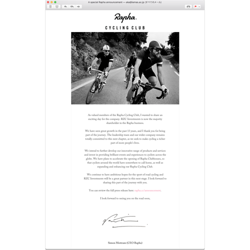 8月8日の未明、ふと目が覚めてチェックすると、サイモン・モットラム(Simon Mottram)氏からの「A special Rapha announcement」なるメールが届いていた。同氏はサイクリングに特化したアパ