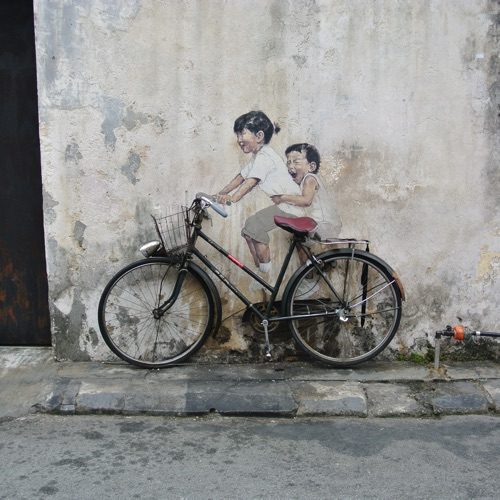 自転車をモチーフにした絵画は数多くあるが、なかでもErnest Zacharevic氏の「Little Children on a Bicycle」は印象的な作品だ。これは、作品名の通り、自転車に乗る幼い2人の子供が描か