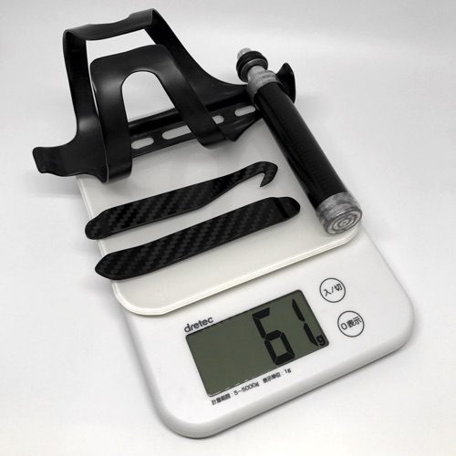 時には軽い話を少々。ボトルケージ28g、携帯ポンプ23g、タイヤレバー2本10g、合計61g。いずれもカーボン・ファイバー製。手元にあった一般的な製品の重量は、ジラルミン製ボトルケージ36g、アルミ合金製携帯ポンプ67g