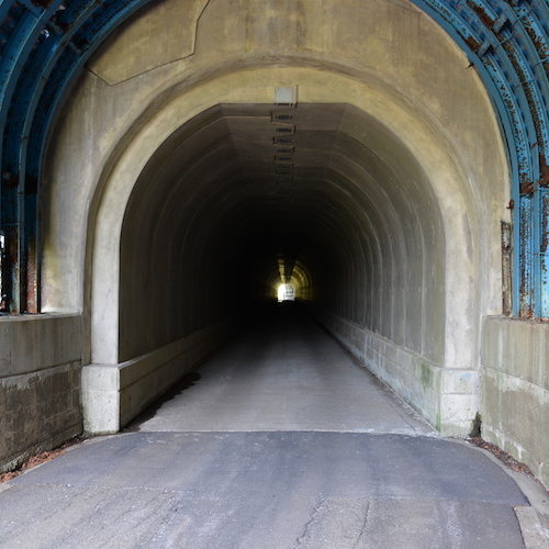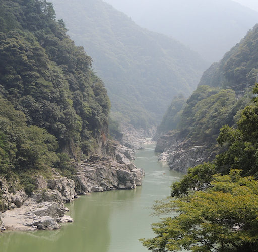 ペダルを踏み続け、坂を登りきった。下り坂に入ると同時に、景色が開けた。 両側にそびえる急勾配の山が空をV字に切り取っていた。同じ地形が奥の方まで続いている。谷底では水流とゴツゴツとした岩が勢いよくぶつかりしぶきを上げてい