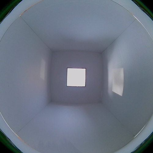 前回実験した、天井開口と壁面開口の2種類の開口の違いから生まれた光と影の構成のうち、壁面開口バージョンからはカメラ・オブスキュラのような表現が得られた。風景を眺めるための建築的な開口部ではなく、風景を光の像として取り入れ