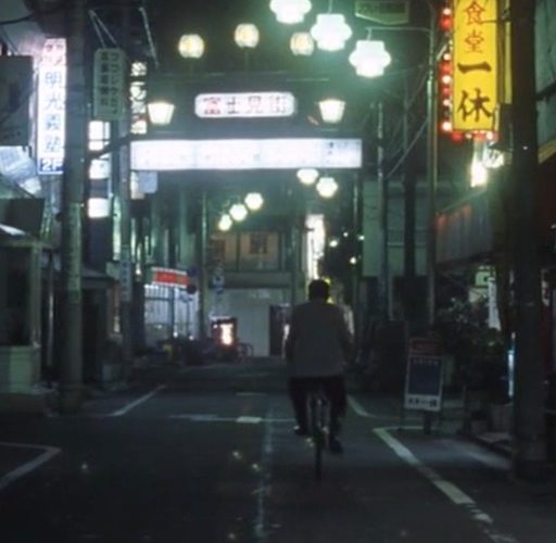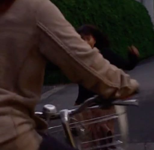 夕闇迫る坂道を全力疾走する足立麻子(を演じるのは小泉今日子)。背景には、黄色いゴミ袋がやたらと目立つ。次のカットで、全力疾走のまま道を右折しようと膨らんだところを(といっても少々わざとらしい)、突如現れた自転車から身を逸